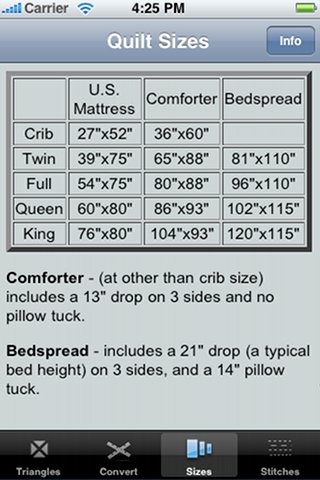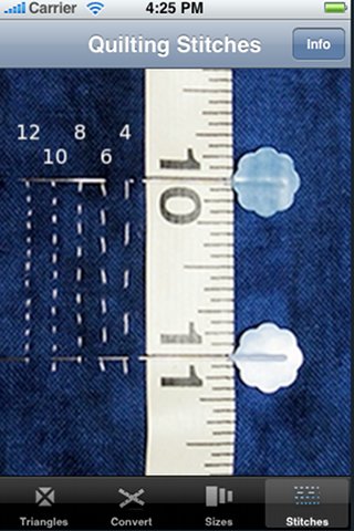 QuiltRef [App Store link] is a free mobile quilt reference app that is not just for quilters, but for quilt fans too. This utility for the Apple iPhone and iPod touch provides useful information whether you are in a quilt shop buying fabric, at a quilt show admiring others' handiwork, or hunting antique quilts at auctions and yard sales.